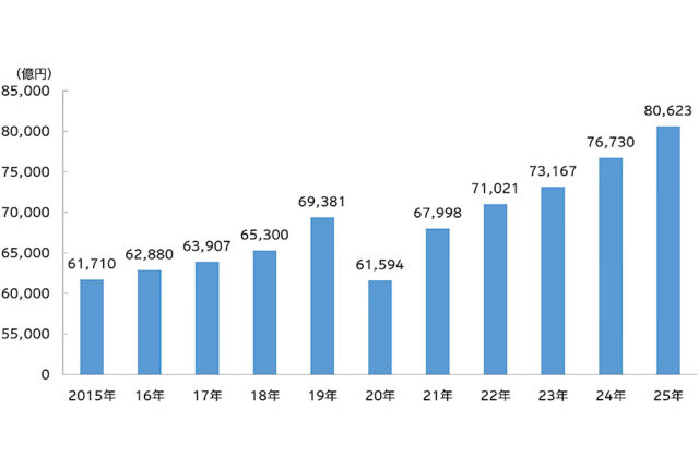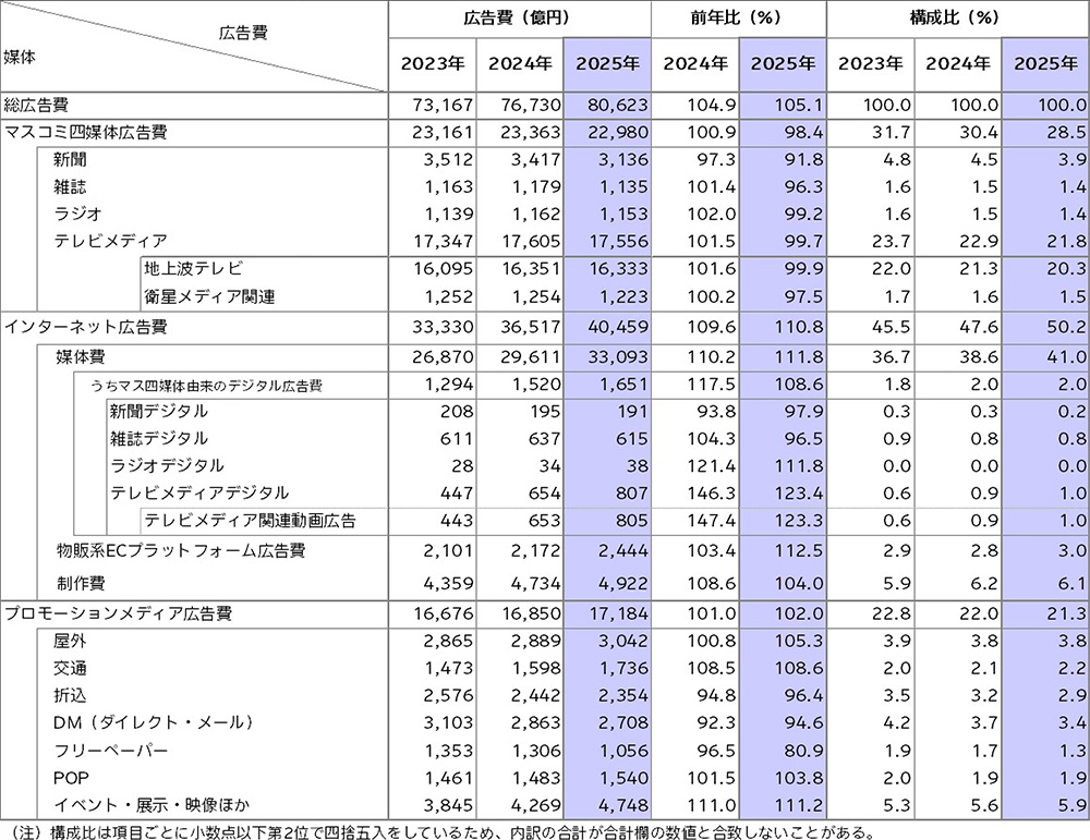 これによると、2025年の総広告費は、通年で8兆623億円(前年比105.1%)となり、2021年から5年連続で成長し、4年連続で過去最高を更新した。企業の好業績によるデジタル投資の加速や、大型イベントの開催などが成長を後押ししたとしている。