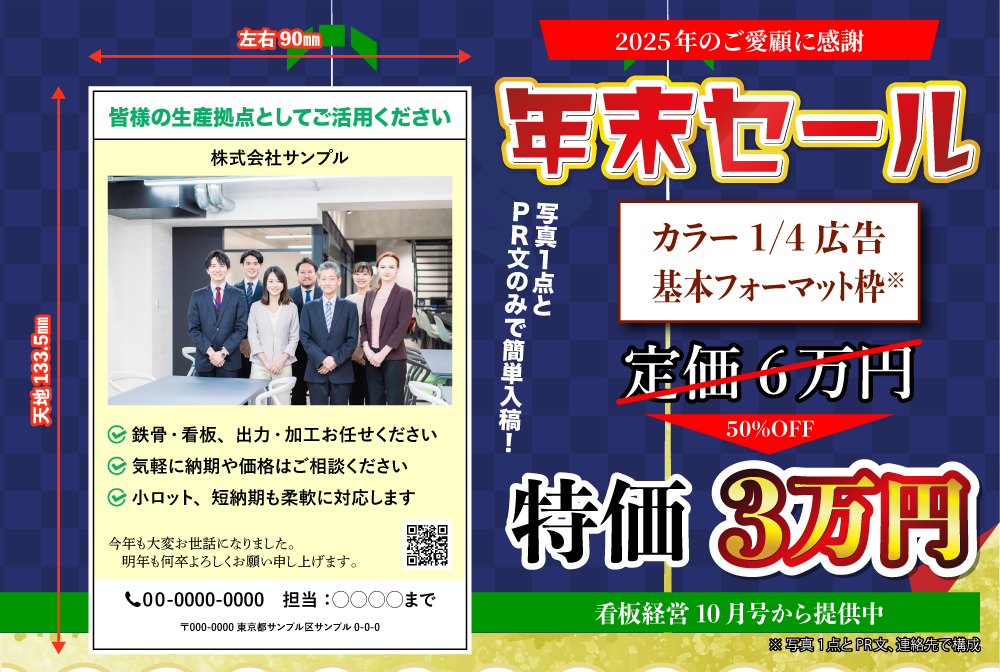 ぜひ、サイン業界内企業へ向けた年始のご挨拶をはじめ、生産体制のPRや、協力会社の募集に同広告枠をご活用ください。もし、ご不明な点などございましたら、お気軽に編集部までお問い合わせください。